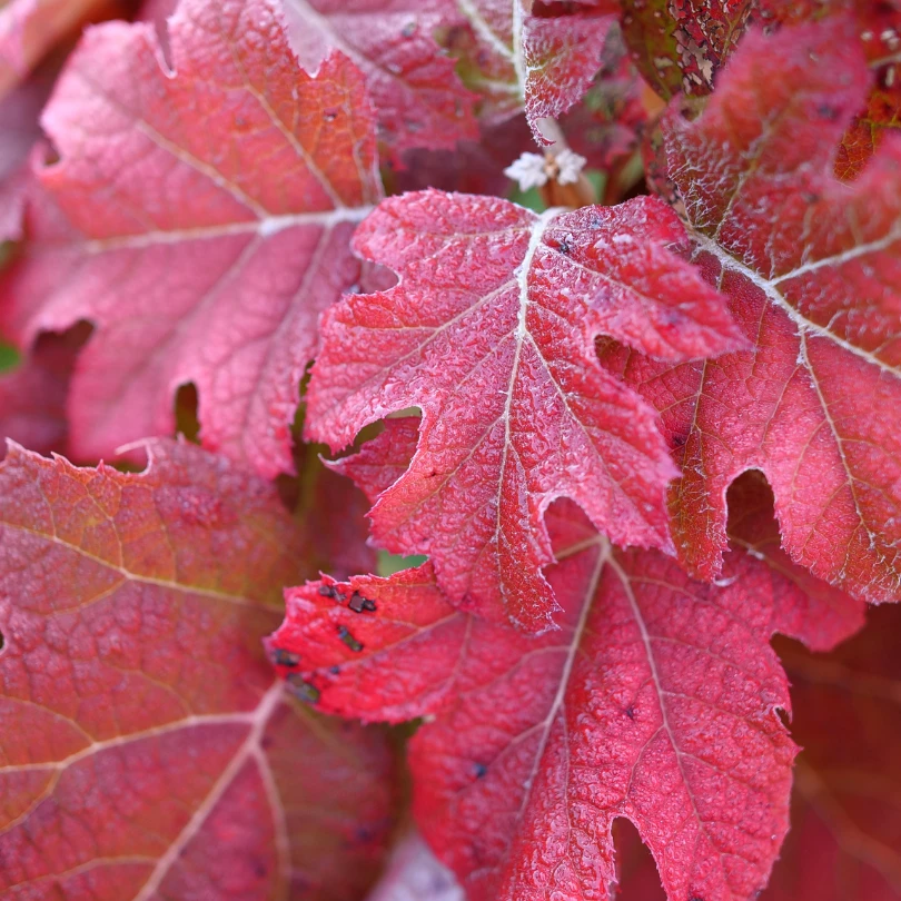 - Native hydrangea with showy white summer flowers & fiery fall foliage.